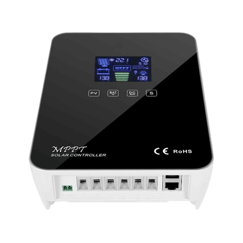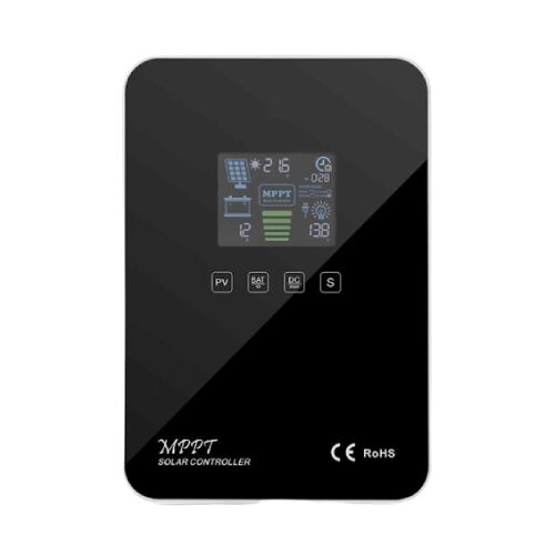 An MPPT charge controller with three-stage charge options and conversion efficiency up to 99%. The charge controller works with both 12V and 24V battery voltage configurations, a range of battery types, and can be paralleled to work concurrently with the help of RS485 communication ports. An LCD display shows the working conditions and parameters of the device and connected battery energy storage. The charge controller can be monitored via a PC and a mobile application.